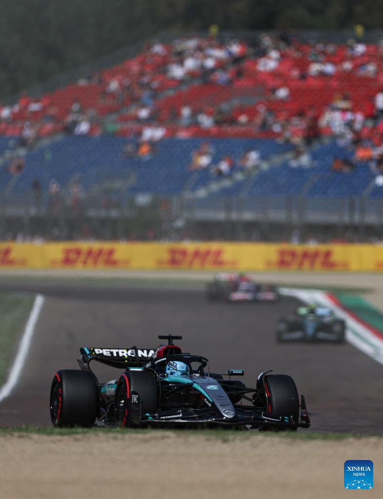 Mercedes' British driver George Russell competes during the qualifying session of the Formula One Emilia Romagna Grand Prix held at the Autodromo Internazionale Enzo e Dino Ferrari race track in Imola, Italy, May 18, 2024. (Xinhua/Li Jing)