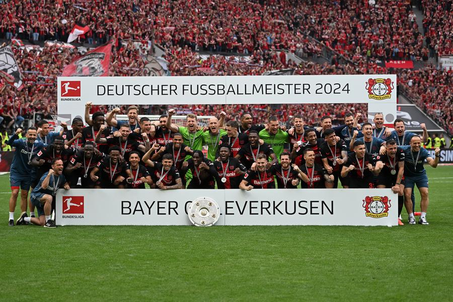 BERLIN, May 18 (Xinhua) -- Bayer Leverkusen became the first-ever unbeaten champions in the Bundesliga history after edging Augsburg 2-1 and extending their invincible run to overall 51 matches while Cologne were relegated into the second division after losing 4-1 to newly promoted Heidenheim in the last round in Bundesliga.