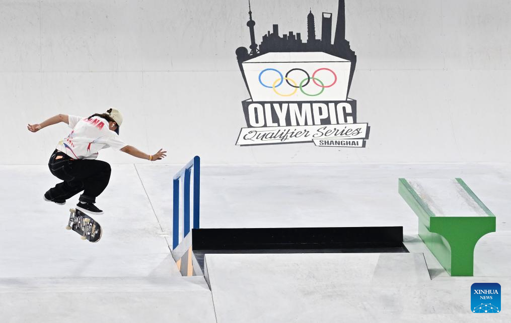 Zeng Wenhui of China competes during the women's street semifinal of skateboarding at the Olympic Qualifier Series Shanghai in east China's Shanghai, May 18, 2024. (Xinhua/Tao Xiyi)