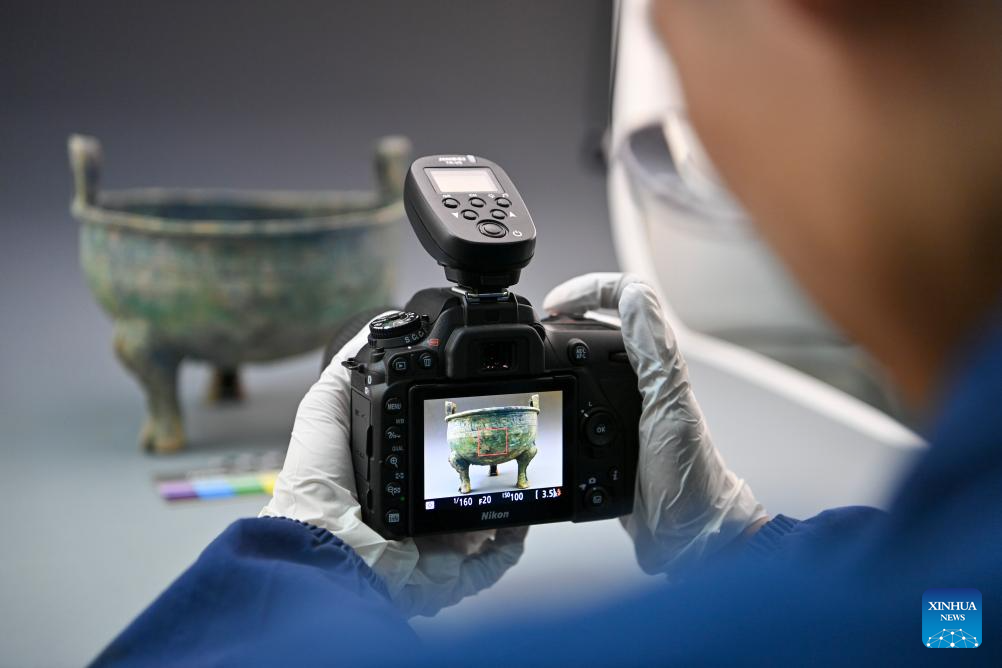 Cultural relics restorer Zhang Zhengmin takes a photo of a bronze ware at Shanxi Museum in Taiyuan, north China's Shanxi Province, May 17, 2024. (Xinhua/Yang Chenguang)