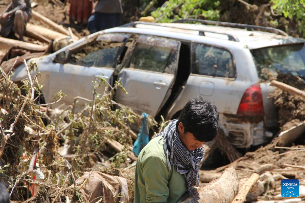 A man walks past a car damaged by flood in Firoz Koh in west Afghanistan's Ghor province, May 18, 2024. Afghanistan has been experiencing heavy rains and floods in the past month, causing casualties and property damage. (Photo by Baktash/Xinhua)