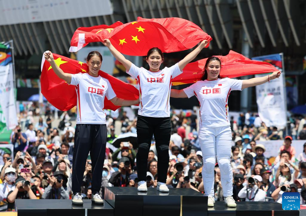 Sun Jiaqi, Sun Sibei and Deng Yawen (L to R) of China celebrate on the podium during the awarding ceremony of the Cycling BMX Freestyle women's park final at the Olympic Qualifier Series Shanghai in east China's Shanghai, May 18, 2024. (Xinhua/Wang Kaiyan)