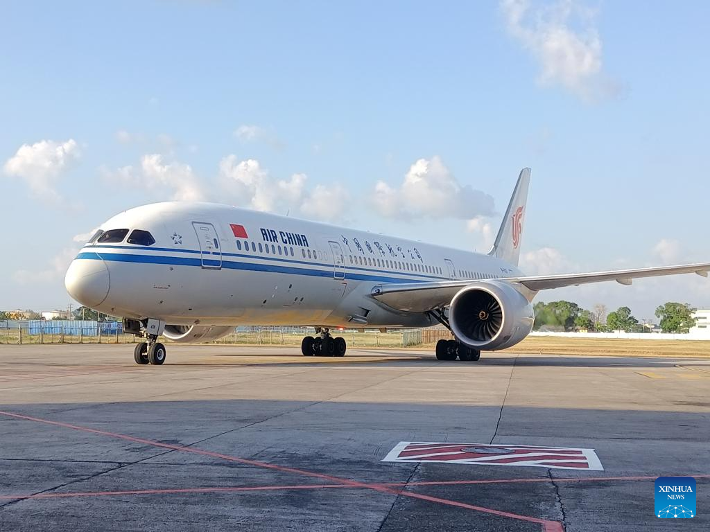 This photo taken on May 17, 2024 shows the first flight to resume air links between Cuba and China at the Jose Marti International Airport in Havana, Cuba. Local authorities said that the first flight to resume air links between Cuba and China arrived in Havana on Friday, with a stopover in Spain, which will enhance connectivity and facilitate exchanges between the two countries. (Xinhua/Lin Zhaohui)