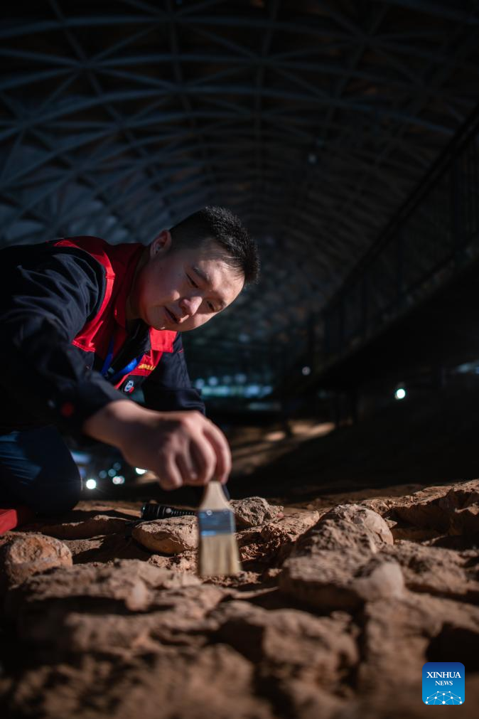 Zhao Bi works on dinosaur egg fossils at Hubei Qinglong Mountain Dinosaur Egg Fossil Site Museum in Shiyan City, central China's Hubei Province, May 16, 2024.