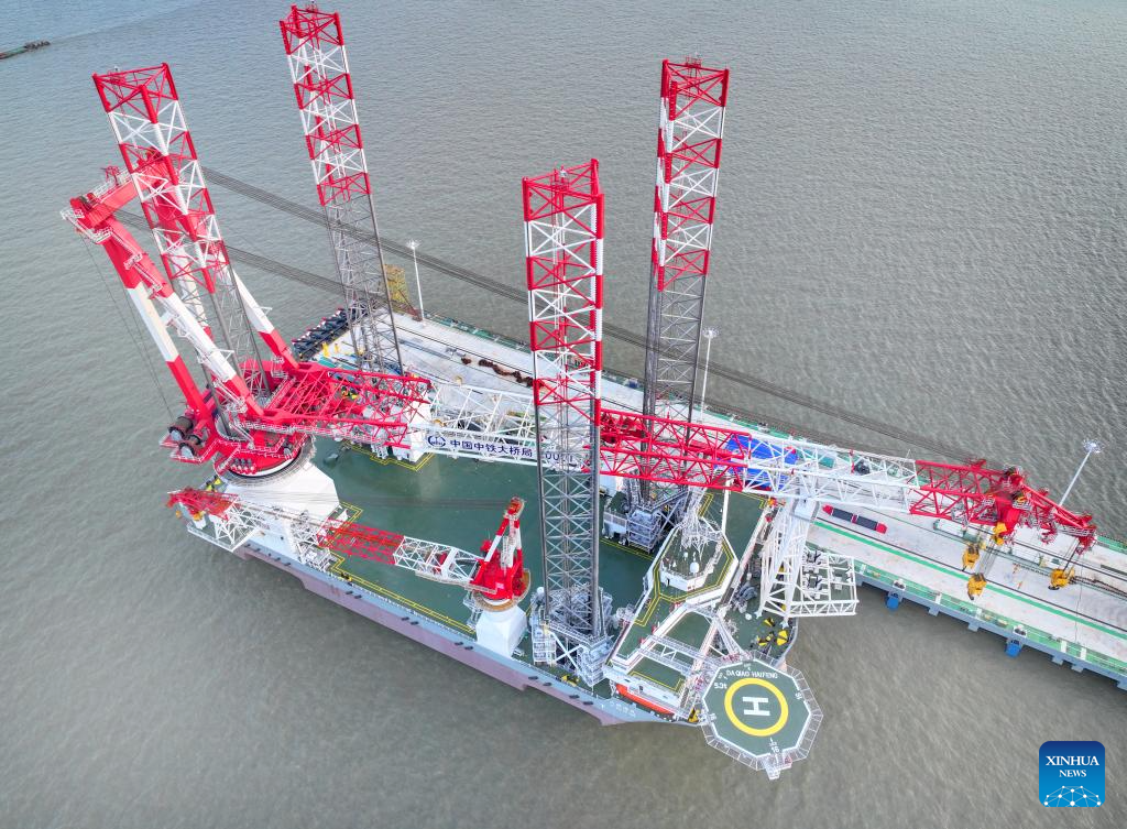 An aerial drone photo taken on May 18, 2024 shows a 2,000-tonne self-elevating wind turbine installation vessel in Nantong, east China's Jiangsu Province. The vessel was delivered on Saturday. (Photo by Xu Congjun/Xinhua)