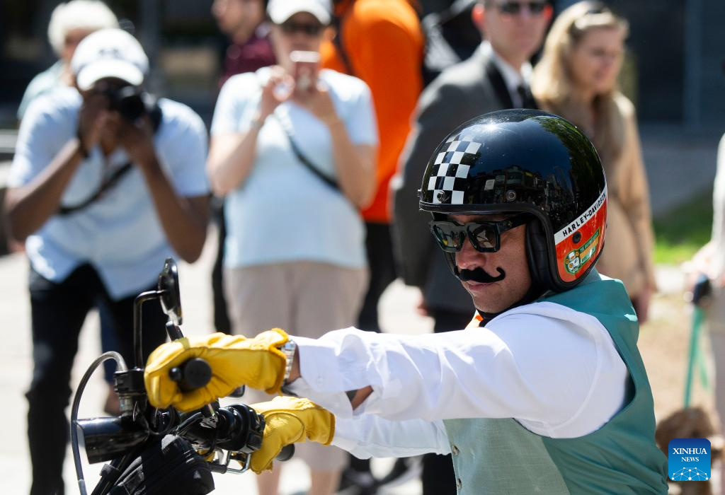 (240520) --TORONTO, May 20, 2024 (Xinhua) -- A dressed-up rider participates in the 2024 Distinguished Gentlemen's Ride event in Toronto, Canada, on May 19, 2024. (Photo by Zou Zheng/Xinhua)