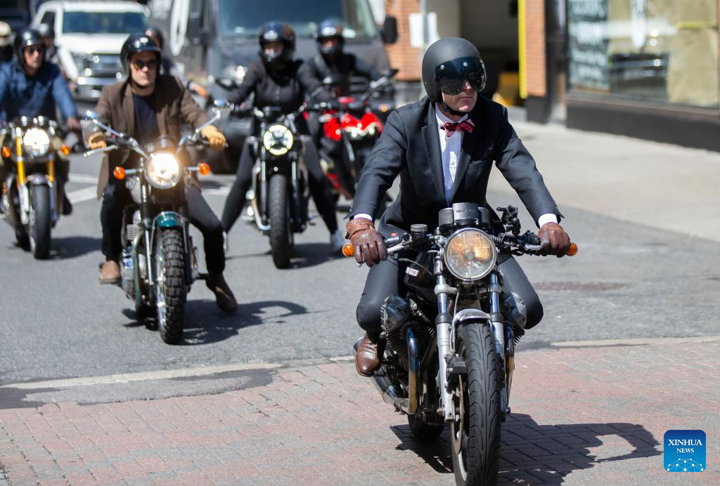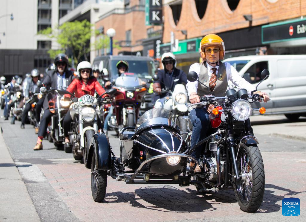 (240520) --TORONTO, May 20, 2024 (Xinhua) -- Dressed-up riders participate in the 2024 Distinguished Gentlemen's Ride event in Toronto, Canada, on May 19, 2024. (Photo by Zou Zheng/Xinhua)