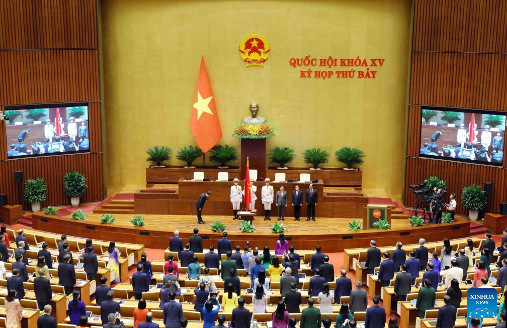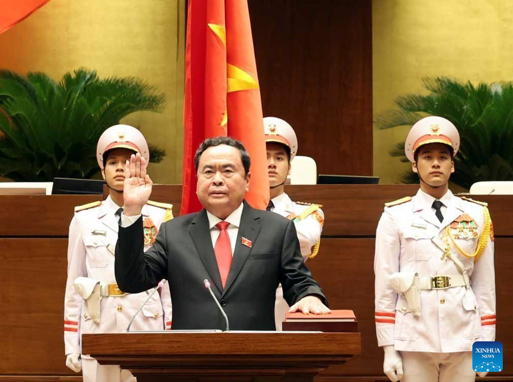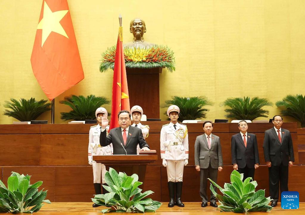 Tran Thanh Man is sworn in as Vietnam's National Assembly chairman in Hanoi, Vietnam, May 20, 2024. The National Assembly (NA) of Vietnam on Monday elected Tran Thanh Man as its new chairman, local media reported. (VNA/Handout via Xinhua)