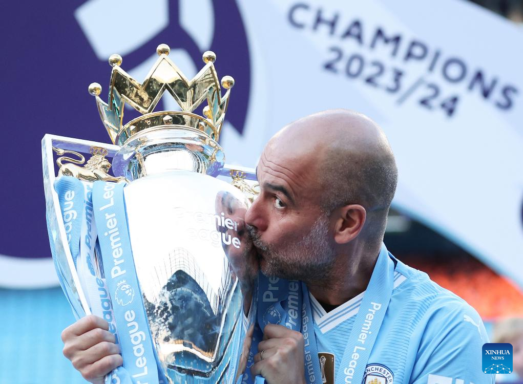 Manchester City's manager Pep Guardiola kisses the Premier League trophy after the English Premier League football match between Manchester City and West Ham United in Manchester, Britain, on May 19, 2024. (Xinhua)