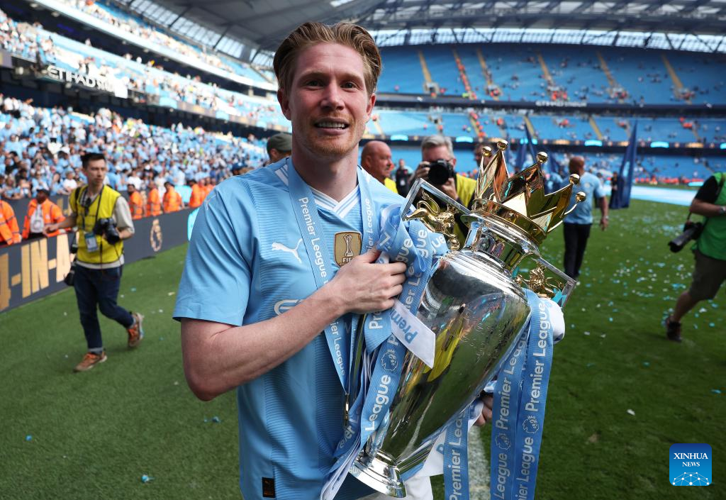 Kevin De Bruyne of Manchester City celebrates with the Premier League trophy after the English Premier League football match between Manchester City and West Ham United in Manchester, Britain, on May 19, 2024. (Xinhua)