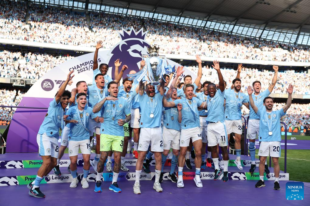Players of Manchester City celebrate with the Premier League trophy after the English Premier League football match between Manchester City and West Ham United in Manchester, Britain, on May 19, 2024. (Xinhua)