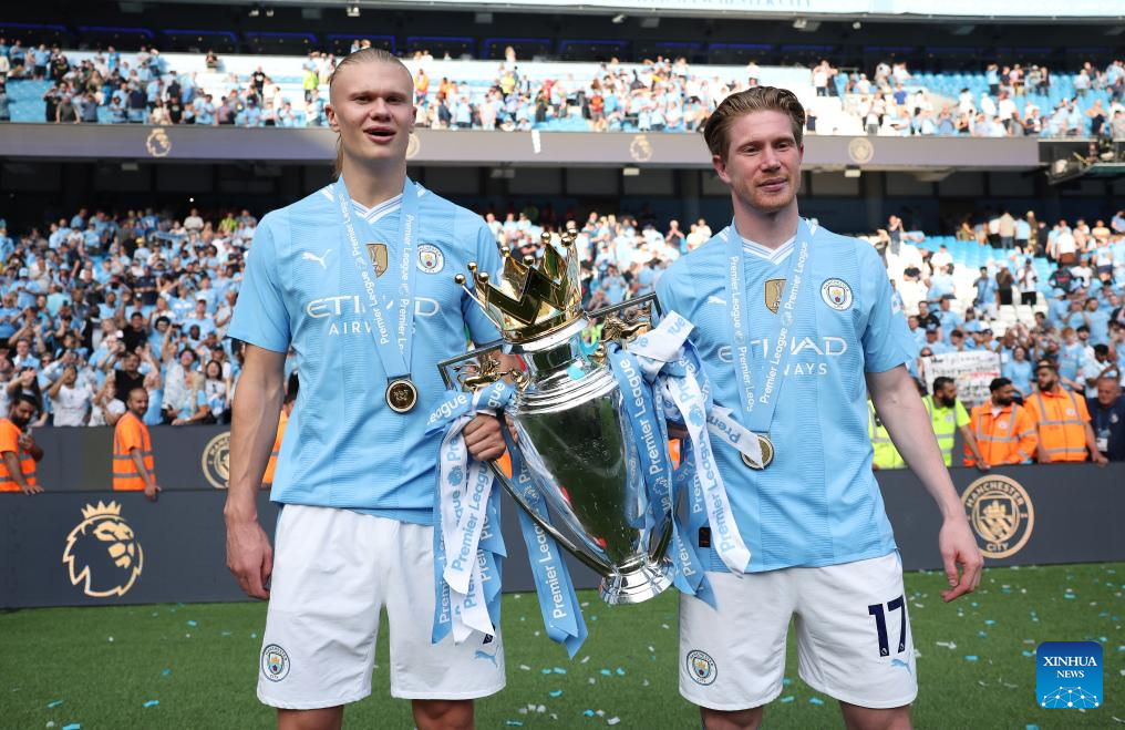Erling Haaland (L) and Kevin De Bruyne of Manchester City celebrate with the Premier League trophy after the English Premier League football match between Manchester City and West Ham United in Manchester, Britain, on May 19, 2024. (Xinhua)