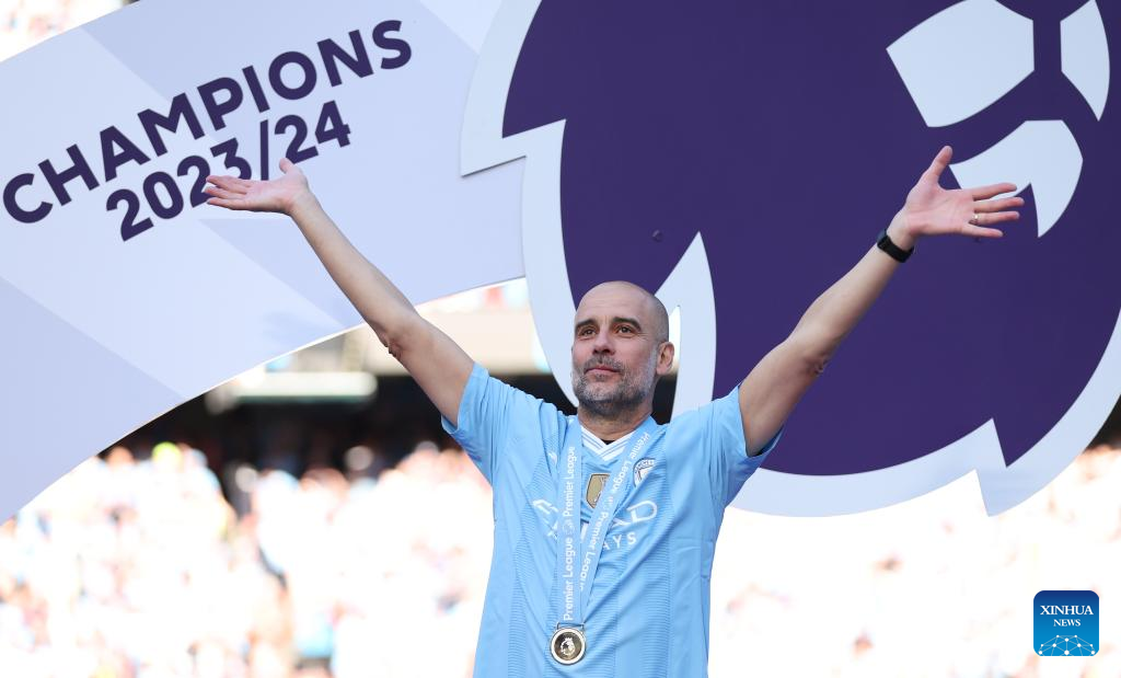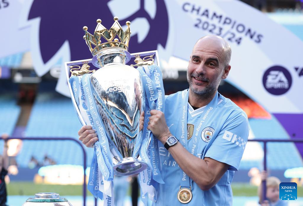 Manchester City's manager Pep Guardiola celebrates with the Premier League trophy after the English Premier League football match between Manchester City and West Ham United in Manchester, Britain, on May 19, 2024. (Xinhua)