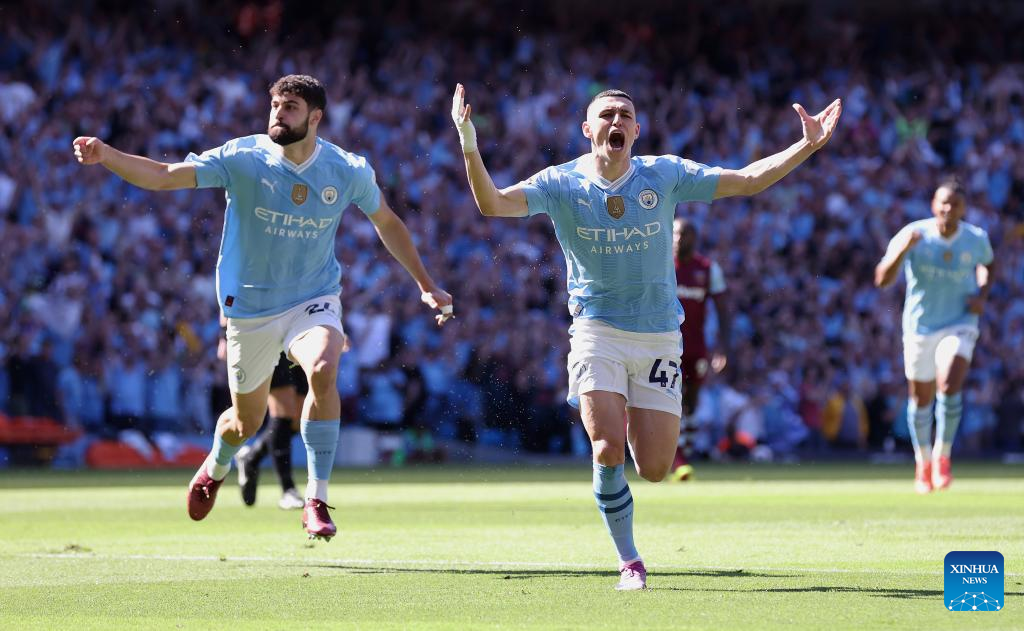 Phil Foden (Front) of Manchester City celebrates after scoring during the English Premier League football match between Manchester City and West Ham United in Manchester, Britain, on May 19, 2024. (Xinhua)