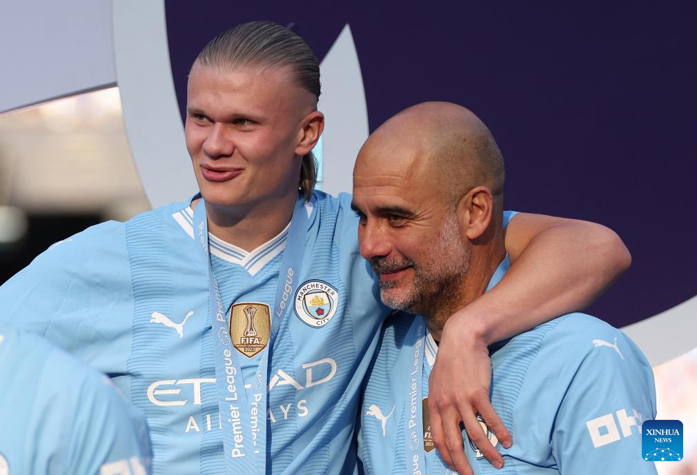 Manchester City's manager Pep Guardiola (R) celebrates with Erling Haaland after the English Premier League football match between Manchester City and West Ham United in Manchester, Britain, on May 19, 2024. (Xinhua)