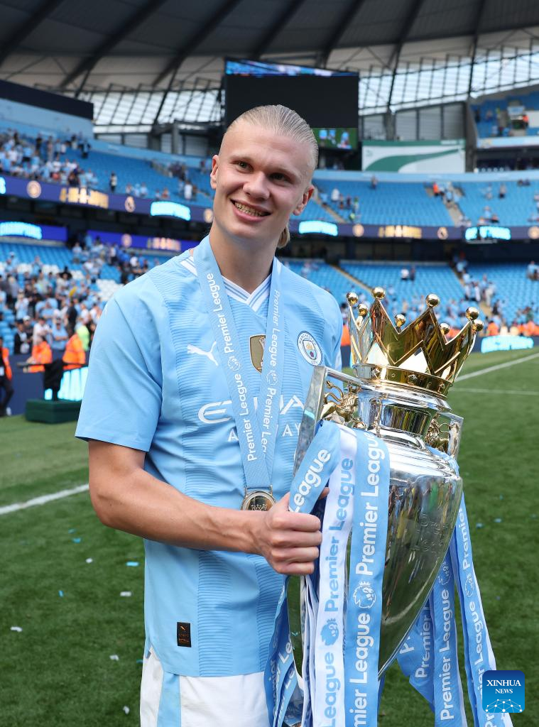 Erling Haaland of Manchester City celebrates with the Premier League trophy after the English Premier League football match between Manchester City and West Ham United in Manchester, Britain, on May 19, 2024. (Xinhua)