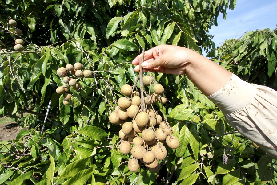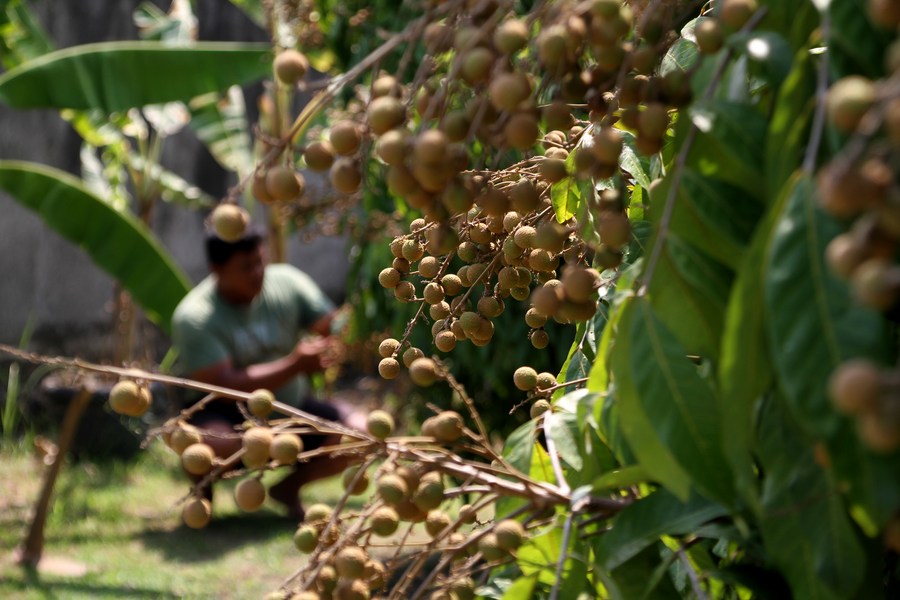 A villager shows longan fruits in Triyagan village in Sukoharjo district, Central Java, Indonesia, May 19, 2024. (Photo by Bram Selo/Xinhua)