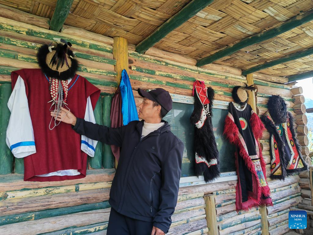 Tashi displays traditional costumes of Lhoba ethnic group in his cabin in Medog County, southwest China's Xizang Autonomous Region, April 26, 2024.(Xinhua/Huang Yaoman)