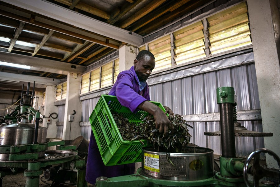 A worker processes purple tea leaves at a purple tea workshop in Murang'a County, Kenya, on May 7, 2024. (Xinhua/Han Xu)