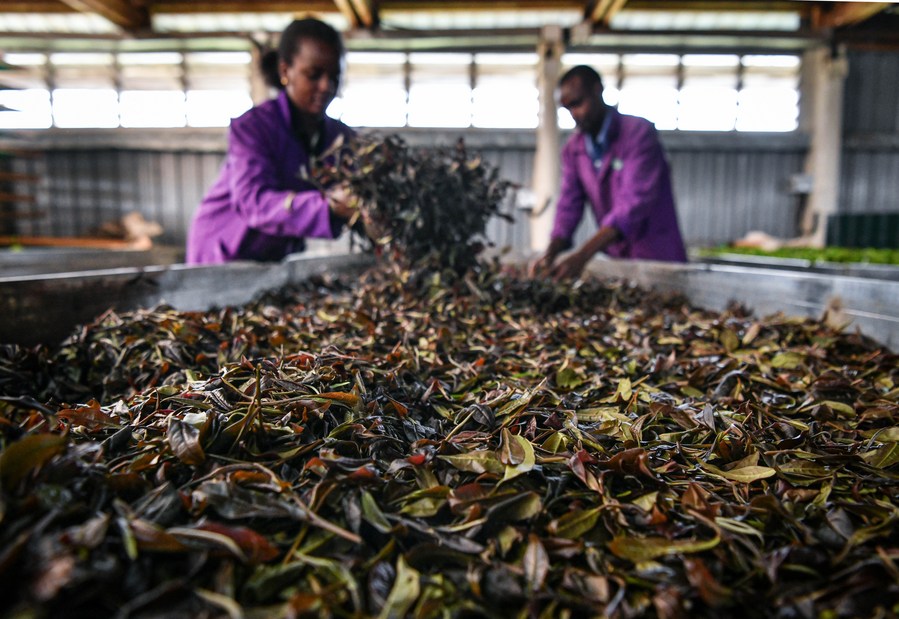Workers process purple tea leaves at a purple tea workshop in Murang'a County, Kenya, on May 7, 2024. (Xinhua/Han Xu)