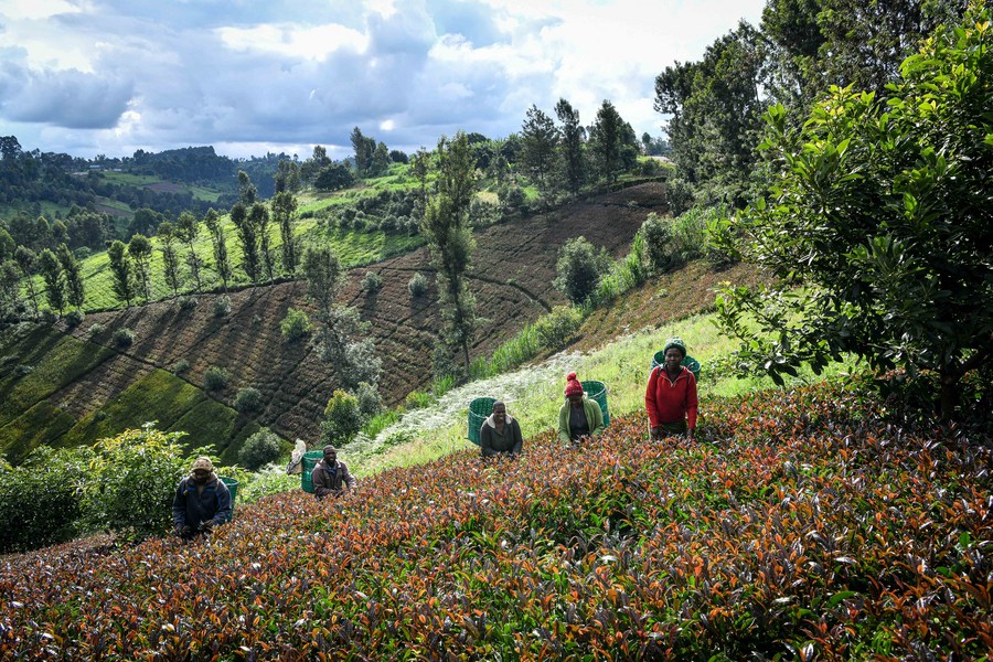 Tea farmers pick purple tea leaves at a purple tea plantation in Murang'a County, Kenya, on May 7, 2024. (Xinhua/Han Xu)