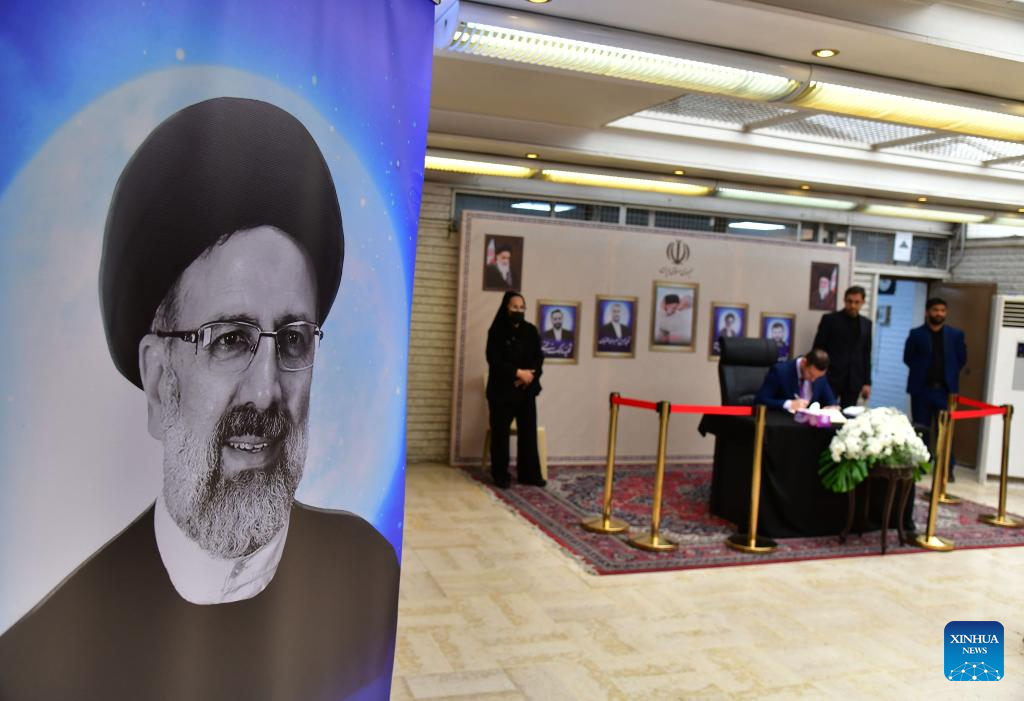 Iranian embassy in Syria holds a memorial service in Damascus, Syria, for the victims of the helicopter crash near Varzaqan County, Iran, on May 21, 2024. Iranian President Ebrahim Raisi and some members of his accompanying team, including Foreign Minister Hossein Amir-Abdollahian, were confirmed dead Monday morning as the wreckage of the helicopter carrying them was found following its crash in bad weather on Sunday near Varzaqan County, some 670 km away from Tehran. (Photo by Ammar Safarjalani/Xinhua)