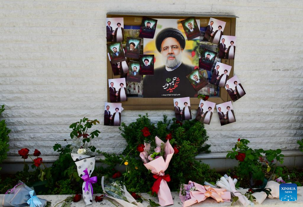 Flowers are seen laid at the Iranian embassy in Syria in Damascus, Syria, to offer condolences for the victims of the helicopter crash near Varzaqan County, Iran, on May 21, 2024. Iranian President Ebrahim Raisi and some members of his accompanying team, including Foreign Minister Hossein Amir-Abdollahian, were confirmed dead Monday morning as the wreckage of the helicopter carrying them was found following its crash in bad weather on Sunday near Varzaqan County, some 670 km away from Tehran. (Photo by Ammar Safarjalani/Xinhua)