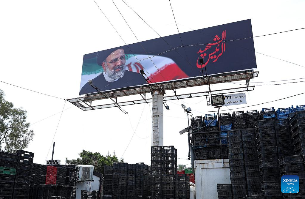 This photo taken on May 22, 2024 shows a poster mourning for Iran's late President Ebrahim Raisi in Beirut, Lebanon. Iranian President Ebrahim Raisi and some members of his accompanying team, including Foreign Minister Hossein Amir-Abdollahian, were confirmed dead Monday morning as the wreckage of the helicopter carrying them was found following its crash in bad weather on Sunday near Varzaqan County, some 670 km away from Tehran. (Xinhua/Bilal Jawich)
