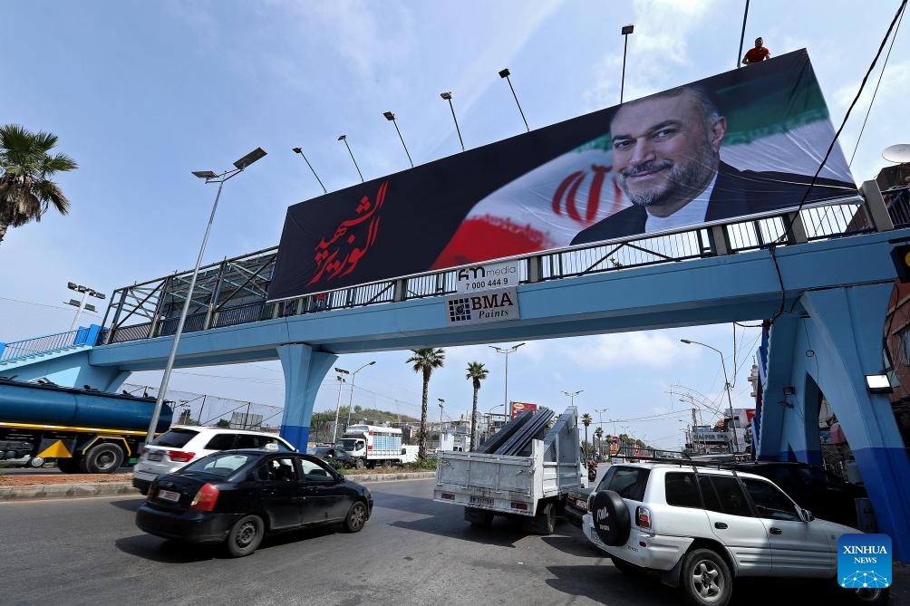 This photo taken on May 22, 2024 shows a poster mourning for Iran's late Foreign Minister Hossein Amir-Abdollahian in Beirut, Lebanon. Iranian President Ebrahim Raisi and some members of his accompanying team, including Foreign Minister Hossein Amir-Abdollahian, were confirmed dead Monday morning as the wreckage of the helicopter carrying them was found following its crash in bad weather on Sunday near Varzaqan County, some 670 km away from Tehran. (Xinhua/Bilal Jawich)