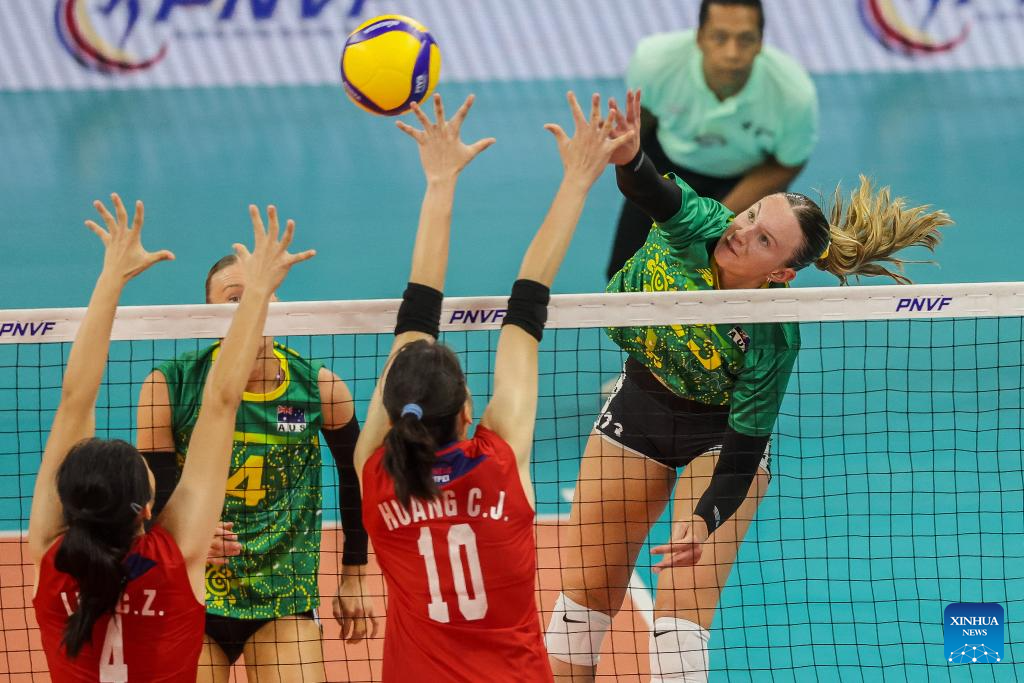 Ella Schabort (1st R) of Australia spikes during the pool A match between Chinese Taipei and Australia at the Asian Women's Volleyball Challenge Cup 2024 in Manila, the Philippines, May 22, 2024. (Xinhua/Rouelle Umali)