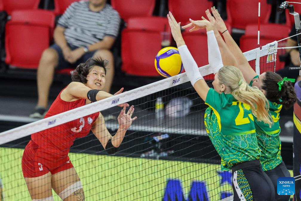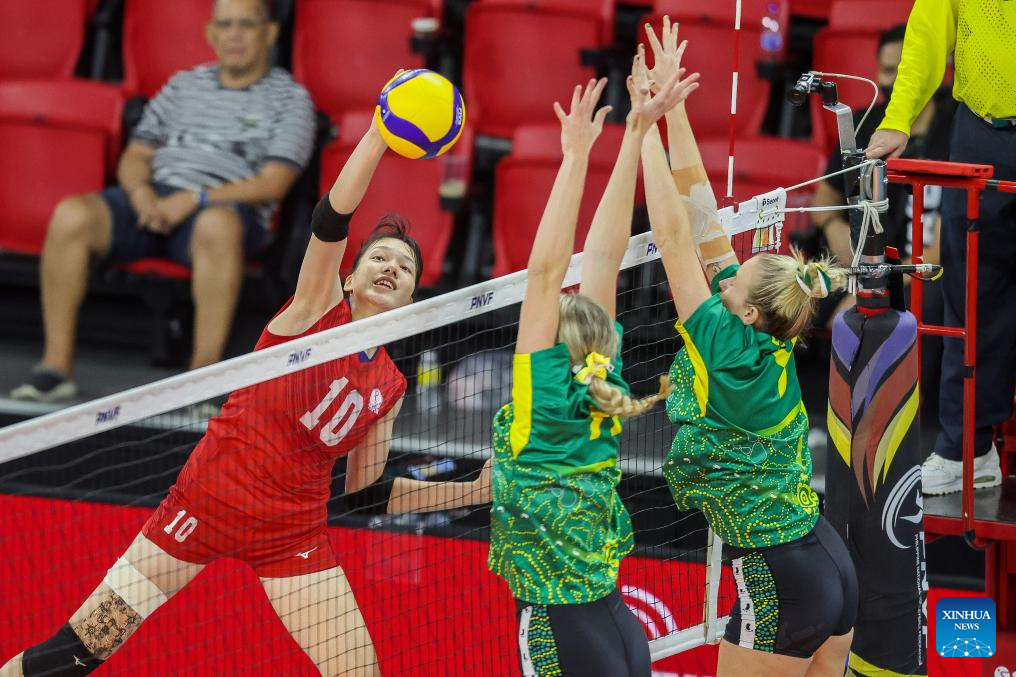 Huang Chun-Jia (L) of Chinese Taipei spikes during the pool A match between Chinese Taipei and Australia at the Asian Women's Volleyball Challenge Cup 2024 in Manila, the Philippines, May 22, 2024. (Xinhua/Rouelle Umali)
