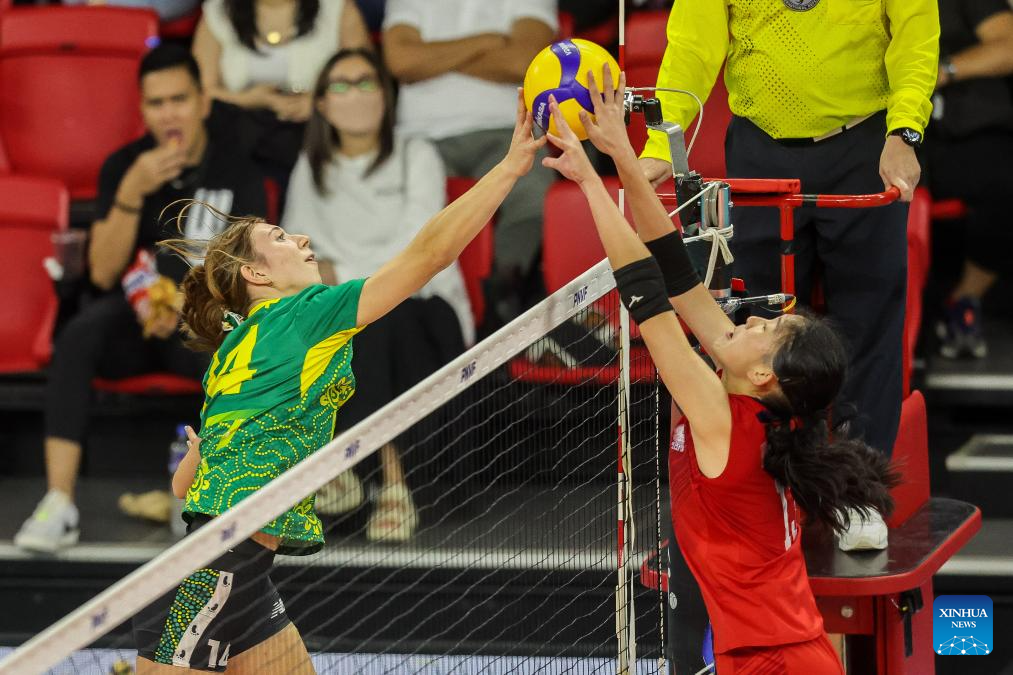 Caitlin Whincup (L) of Australia competes against Pao Yin-Chi of Chinese Taipei during the pool A match between Chinese Taipei and Australia at the Asian Women's Volleyball Challenge Cup 2024 in Manila, the Philippines, May 22, 2024. (Xinhua/Rouelle Umali)