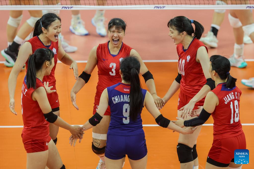 Players of Chinese Taipei celebrate after scoring a point during the pool A match between Chinese Taipei and Australia at the Asian Women's Volleyball Challenge Cup 2024 in Manila, the Philippines, May 22, 2024. (Xinhua/Rouelle Umali)