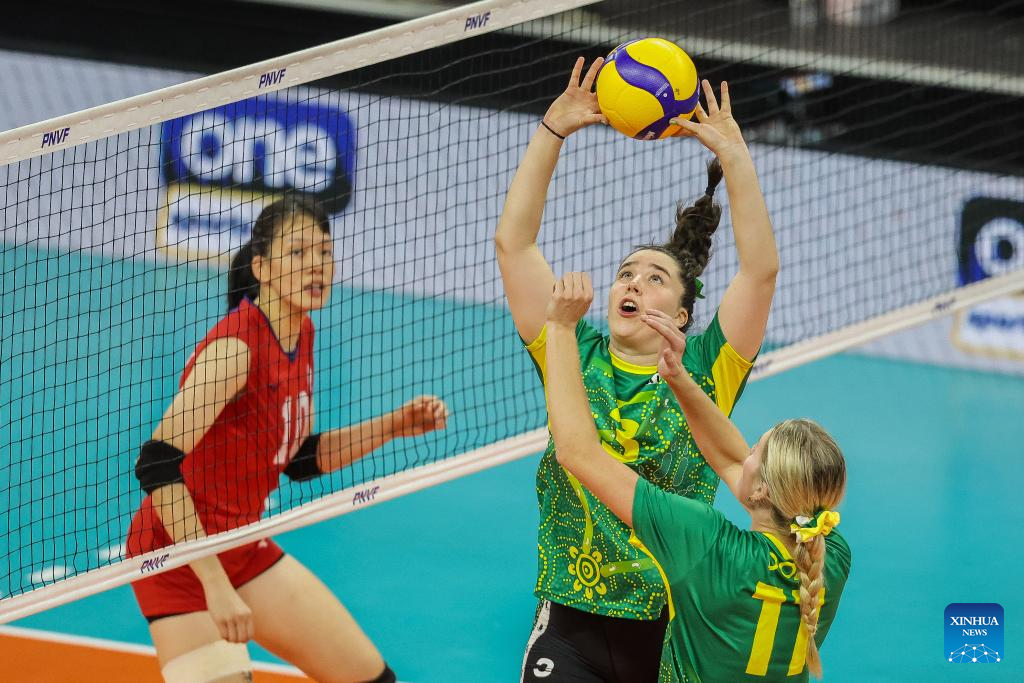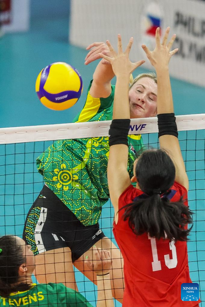 Mikaela Stevens (C) of Australia passes the ball during the pool A match between Chinese Taipei and Australia at the Asian Women's Volleyball Challenge Cup 2024 in Manila, the Philippines, May 22, 2024. (Xinhua/Rouelle Umali)