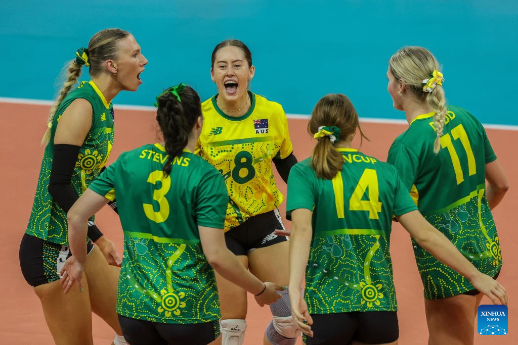 Players of Australia celebrate after scoring a point during the pool A match between Chinese Taipei and Australia at the Asian Women's Volleyball Challenge Cup 2024 in Manila, the Philippines, May 22, 2024. (Xinhua/Rouelle Umali)