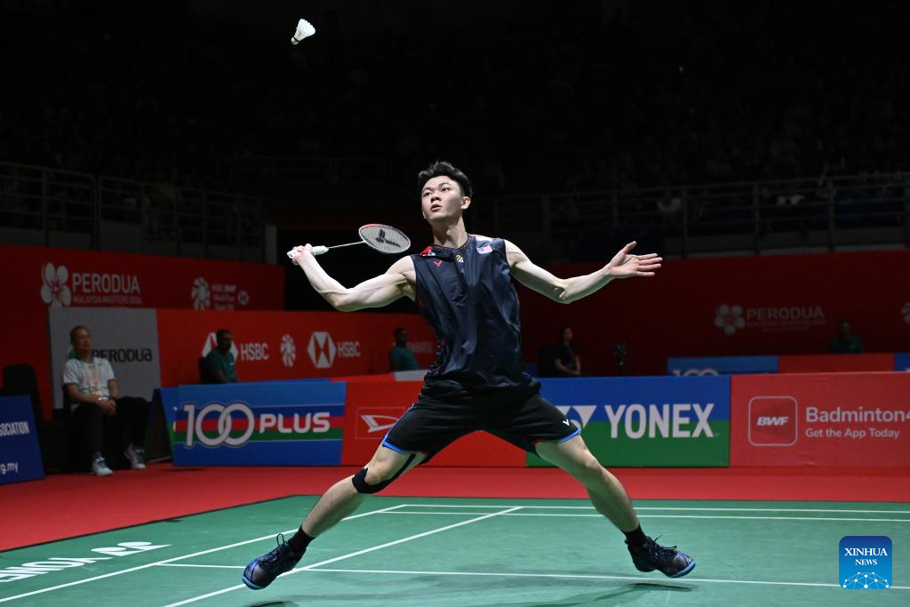Zhao Junpeng of China hits a return during the men's singles round of 32 match against Lee Zii Jia of Malaysia at Malaysia Masters 2024 in Kuala Lumpur, Malaysia, May 22, 2024. (Photo by Chong Voon Chung/Xinhua)
