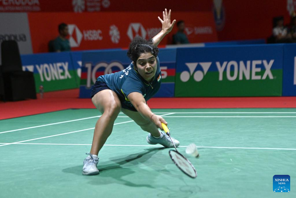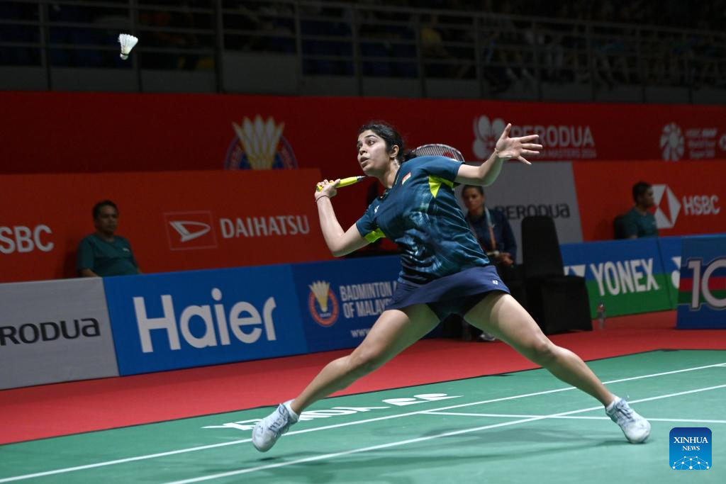Aakarshi Kashyap of India hits a return during the women's singles round of 32 match against Wang Zhiyi of China at Malaysia Masters 2024 in Kuala Lumpur, Malaysia, May 22, 2024. (Photo by Chong Voon Chung/Xinhua)