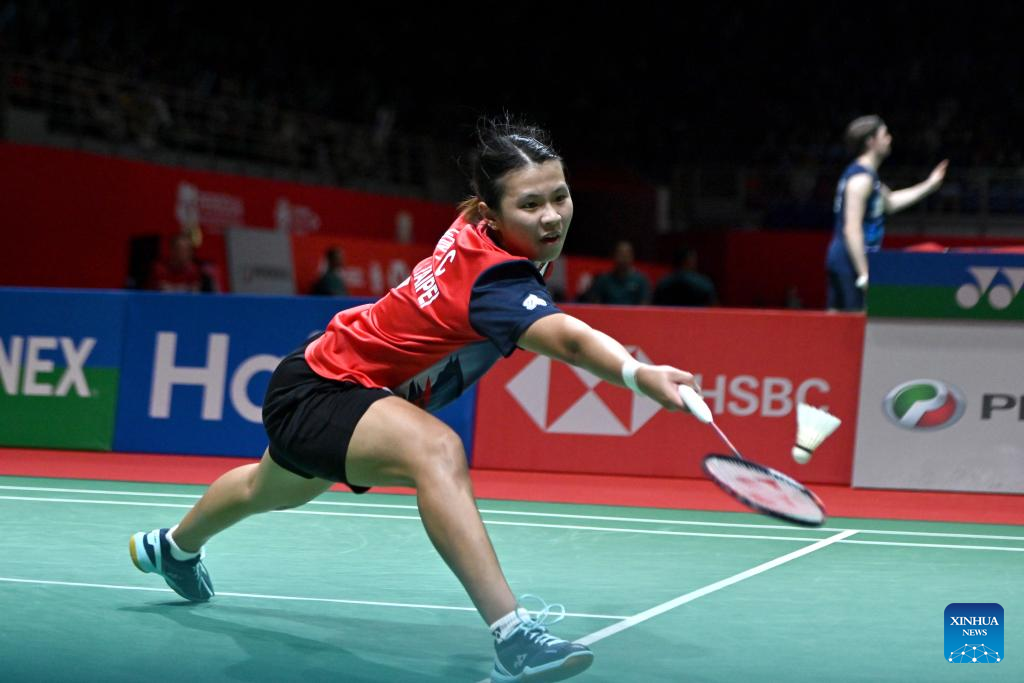 Chiu Pin Chian of Chinese Taipei hits a return during the women's singles round of 32 match against Zhang Yiman of China at Malaysia Masters 2024 in Kuala Lumpur, Malaysia, May 22, 2024. (Photo by Chong Voon Chung/Xinhua)
