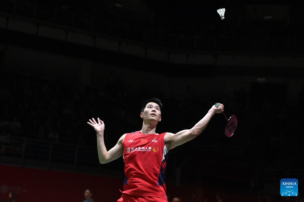 Li Shifeng of China hits a return during the men's singles round of 32 match against Toma Junior Popov of France at Malaysia Masters 2024 in Kuala Lumpur, Malaysia, May 22, 2024. (Photo by Chong Voon Chung/Xinhua)