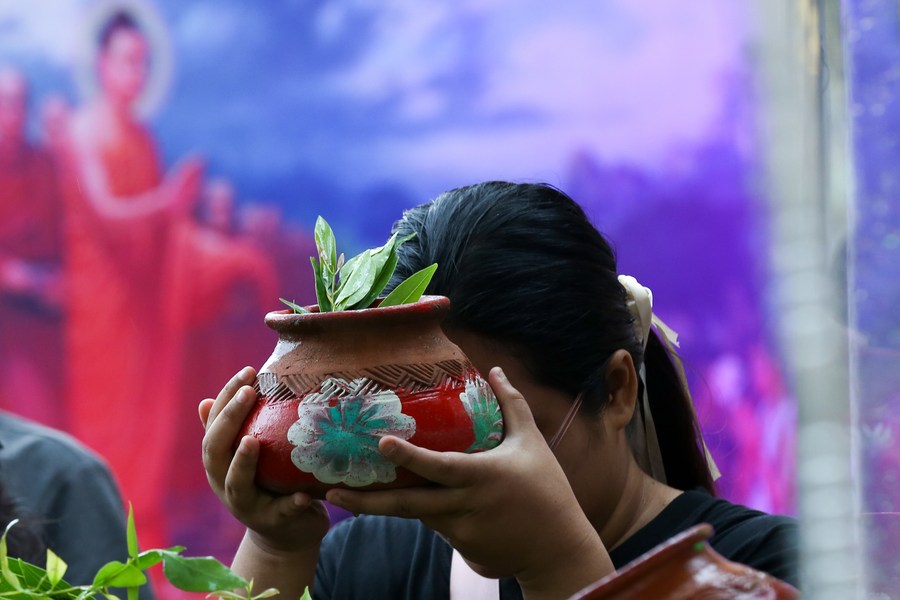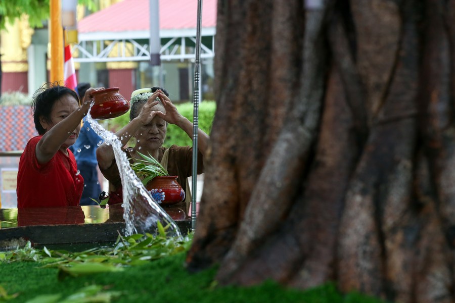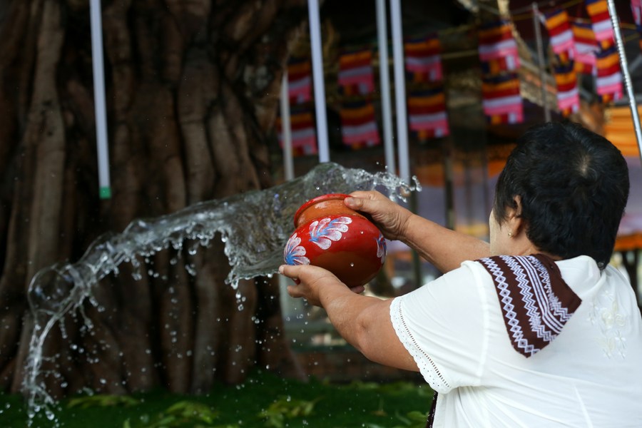 A man waters a Bodhi Tree on the Fullmoon Day of Kason at the Botahtaung Pagoda in Yangon, Myanmar, May 22, 2024. (Xinhua/ Myo Kyaw Soe)■