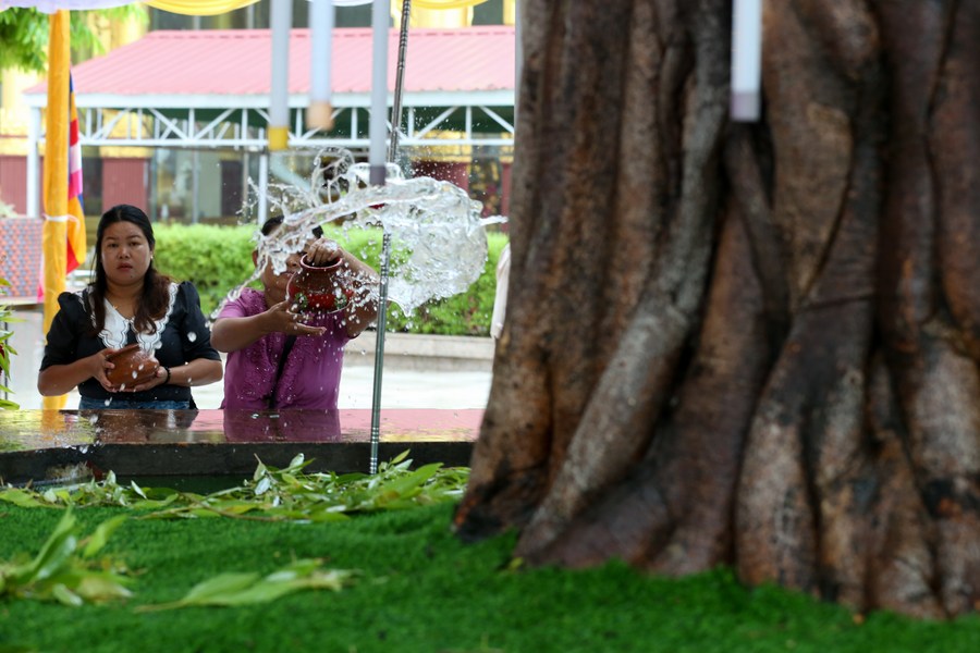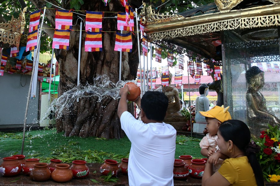 People water a Bodhi tree on the Fullmoon Day of Kason at the Botahtaung Pagoda in Yangon, Myanmar, May 22, 2024. (Xinhua/Myo Kyaw Soe)