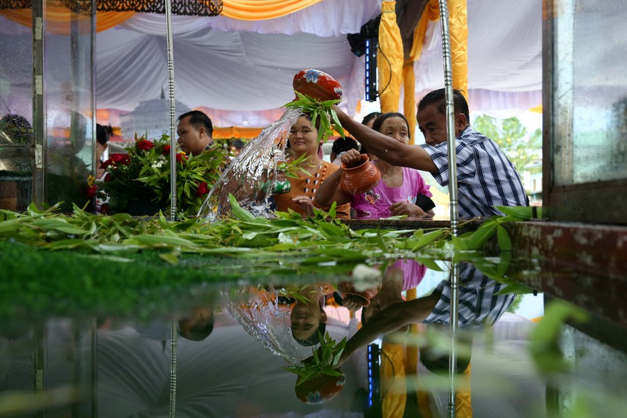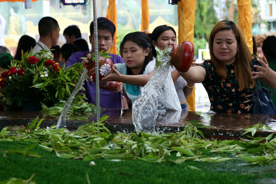 People water a Bodhi Tree on the Fullmoon Day of Kason at the Botahtaung Pagoda in Yangon, Myanmar, May 22, 2024. (Xinhua/ Myo Kyaw Soe)