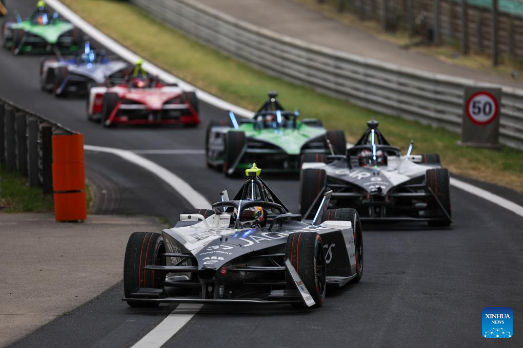 Jaguar TCS Racing's Mitch Evans (front) of New Zealand competes during the FIA Formula E World Championship Shanghai E-Prix race in east China's Shanghai, May 25, 2024. (Photo by Qian Jun/Xinhua)