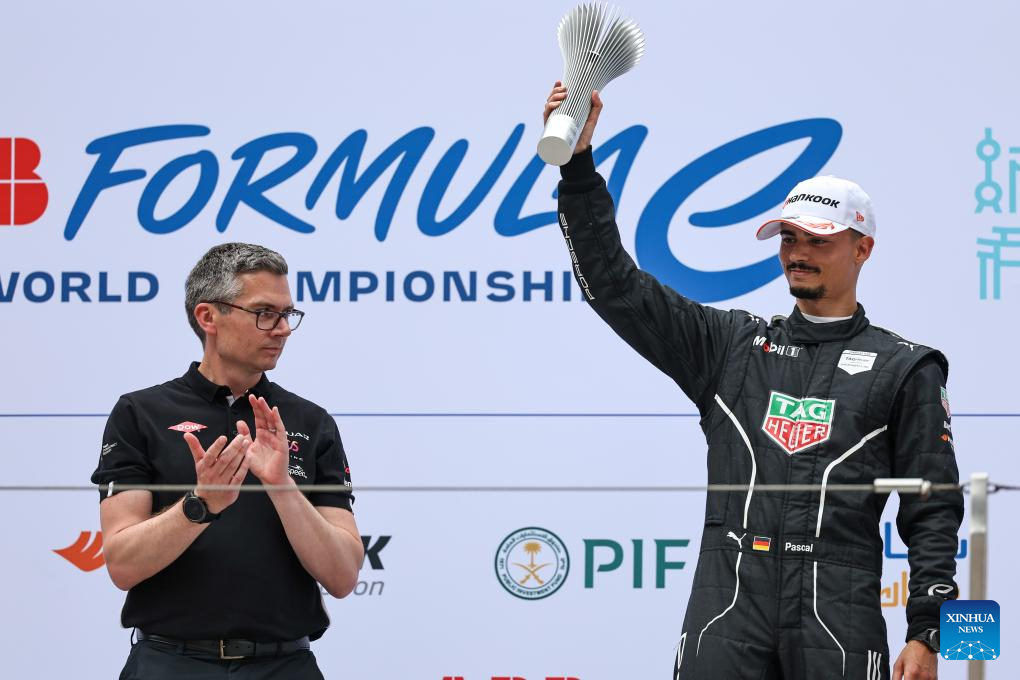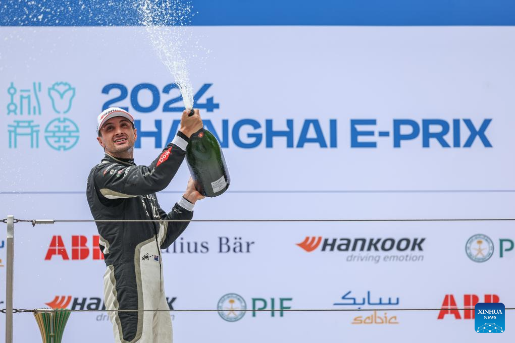 Second placed Tag Heuer Porsche Formula E Team's Pascal Wehrlein (R) of Germany celebrates during the awarding ceremony of the FIA Formula E World Championship Shanghai E-Prix race in east China's Shanghai, May 25, 2024. (Photo by Qian Jun/Xinhua)