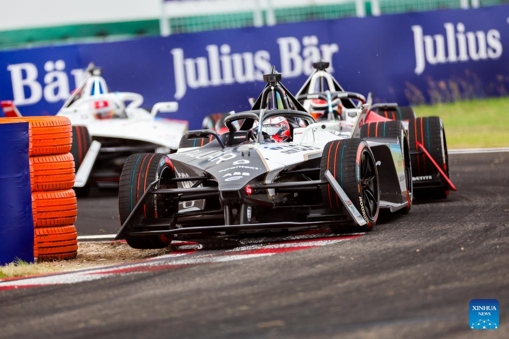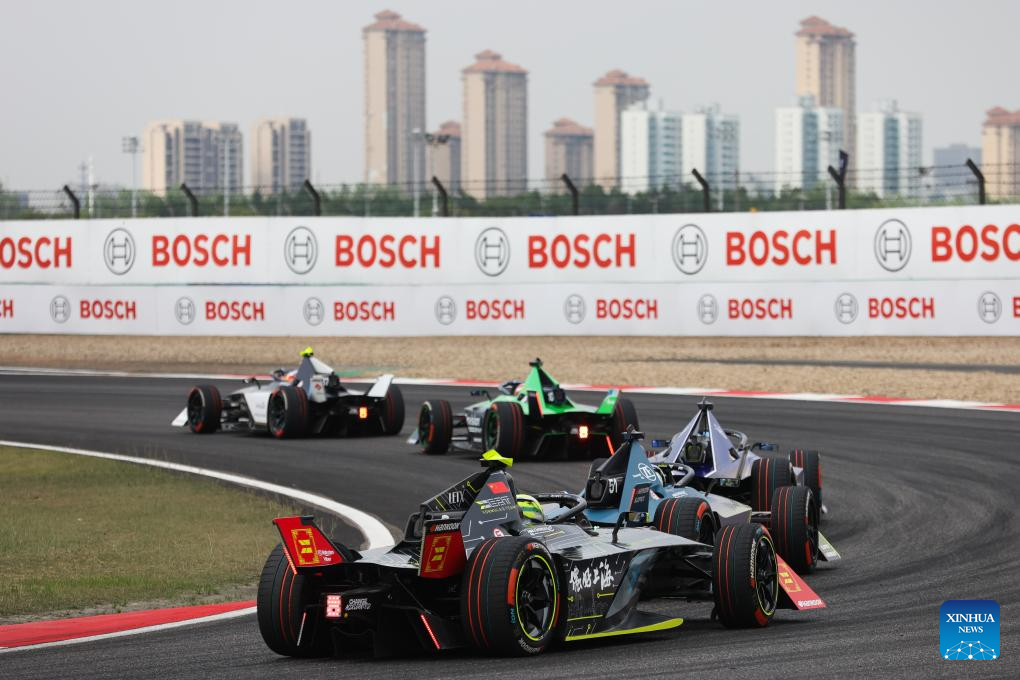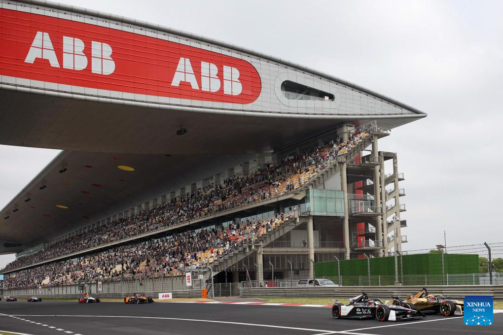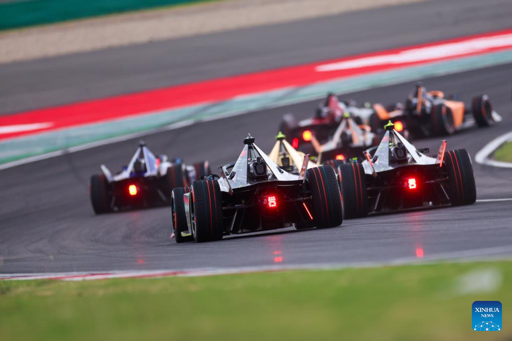 Racers compete during the FIA Formula E World Championship Shanghai E-Prix race in east China's Shanghai, May 25, 2024. (Photo by Qian Jun/Xinhua)