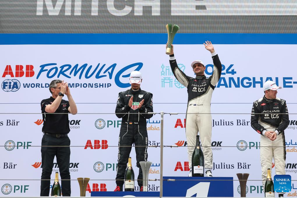 First placed Jaguar TCS Racing's Mitch Evans (2nd R) of New Zealand celebrates during the awarding ceremony of the FIA Formula E World Championship Shanghai E-Prix race in east China's Shanghai, May 25, 2024. (Photo by Qian Jun/Xinhua)