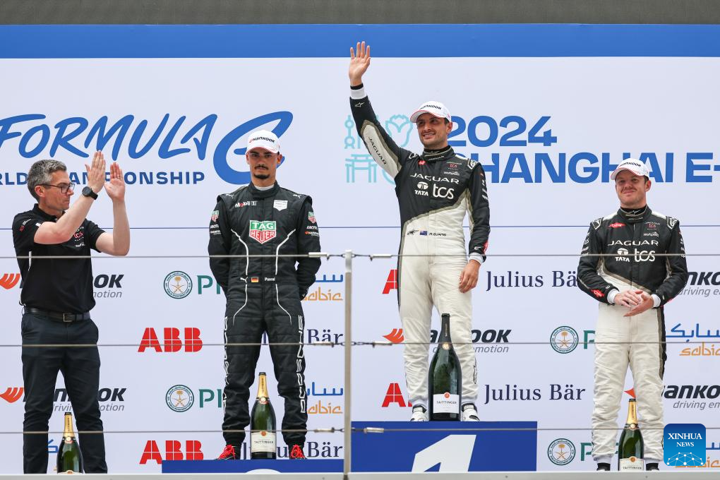 First placed Jaguar TCS Racing's Mitch Evans (2nd R) of New Zealand, second placed Tag Heuer Porsche Formula E Team's Pascal Wehrlein (2nd L) of Germany and third placed Jaguar TCS Racing's driver Nick Cassidy (1st R) of New Zealand celebrate during the awarding ceremony of the FIA Formula E World Championship Shanghai E-Prix race in east China's Shanghai, May 25, 2024. (Photo by Qian Jun/Xinhua)
