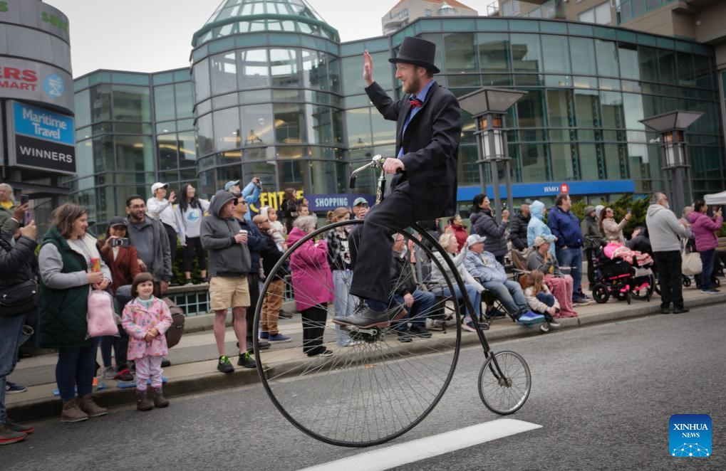 A performer rides a vintage bicycle during the annual Hyack International Parade in New Westminster, British Columbia, Canada, on May 25, 2024. (Photo by Liang Sen/Xinhua)