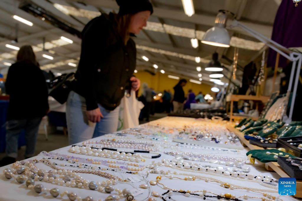 A person selects jewellery at the 2024 Canberra Winter Gemcraft and Mineral Show at the Exhibition Park in Canberra, Australia, May 25, 2024. (Photo by Chu Chen/Xinhua)