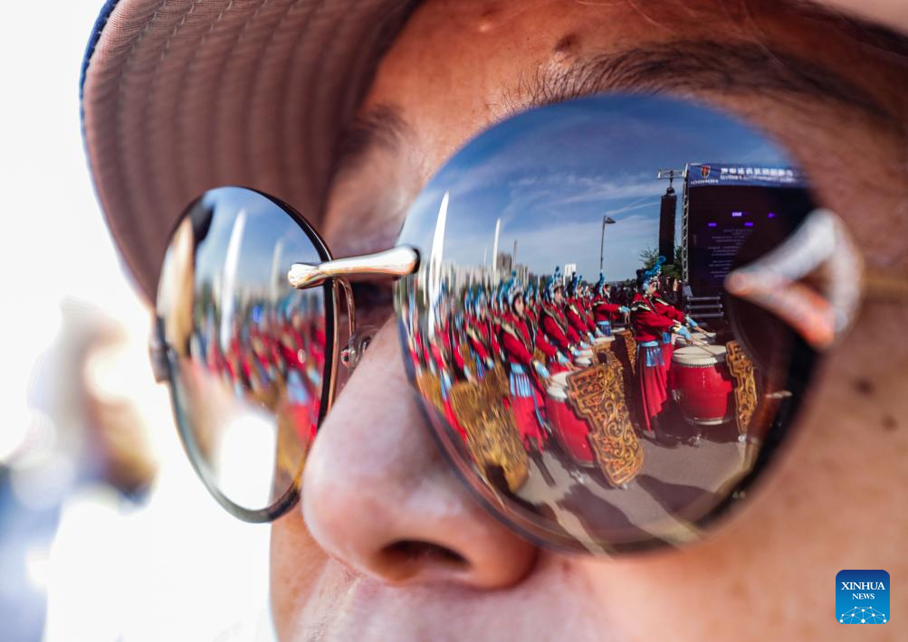 A spectator watches traditional Chinese war drum performance during the 1st Frankfurt Dragonboat Festival in Frankfurt, Germany, May 24, 2025. (Xinhua/Zhang Fan)